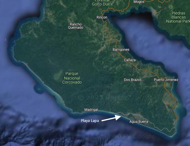 From Puerto Jimenez, you can get to Playa Lapa by continuing south to the gas station and turning right. The Carate highway provides overland access between Puerto Jimenez and Carate year round. However, in the rainy season a number of rivers swell with large rains to make passage intermittent as storm waters recede. Follow the road for 1 hour or so; it is a beautiful drive through imposing primary growth in the mountains and across the lowland pasturage and rice farms of the southwestern part of the peninsula. About a half a mile past the lagoon which you will observe on you left, watch for the sign and front gate to Playa Lapa. The casa is located out at the beach, just follow the driveway through the kahuna palms. Beto, the caretaker will have the from gate open for you; if we know your arrival time, our English speaking assistant will meet you at the Casa to show you in and give you your keys.